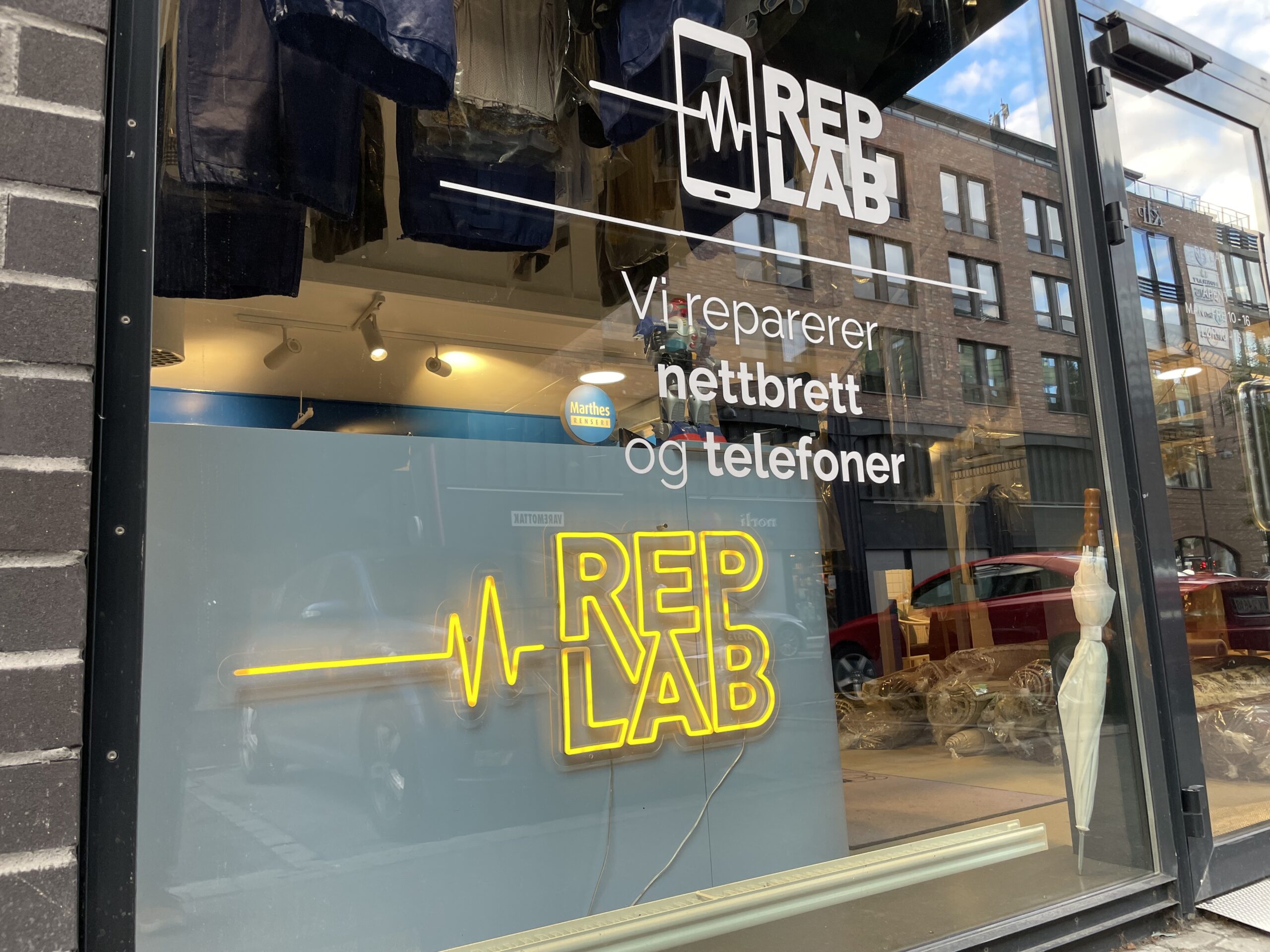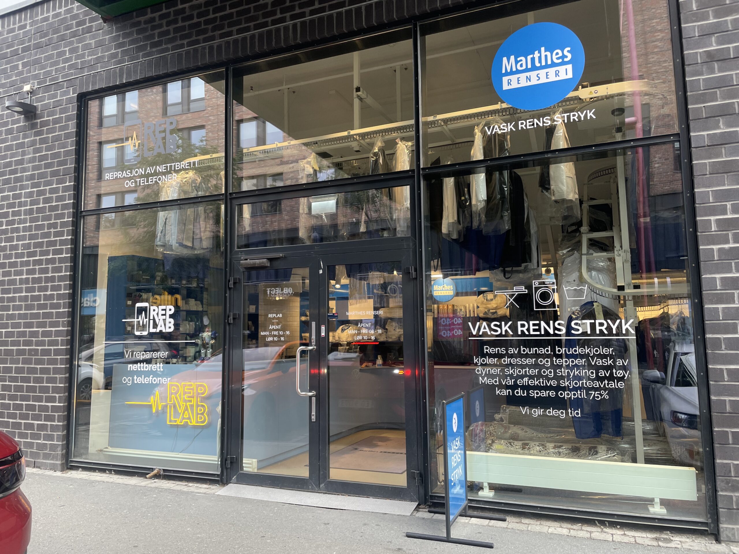 Her finner du RepLab på gateplan, med felles inngang til Marthes Renseri. Se under gangbrua – mellom Sjakk Matt og Dromedar. Her kan du parkere bilen rett utenfor døra, buss stopper også rett ved senteret. Drop-in går fint, men vi prioriterer jobber som er booket på forhånd først.