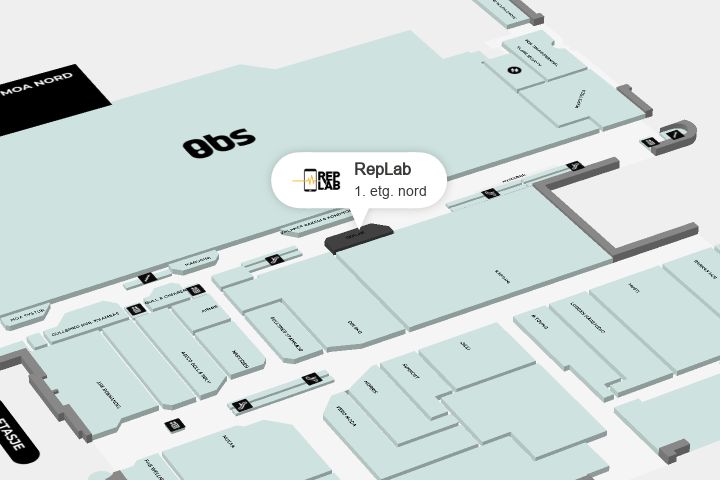 Du finner RepLab midt i «Obs-gangen» på Amfi Moa Nord (gamle Telia-lokalet). Du kan parkere bilen like utenfor (nært bussterminalen) eller i P-kjelleren og ta rullebåndet nærmest rett inn i butikken. Buss stopper også like utenfor.
